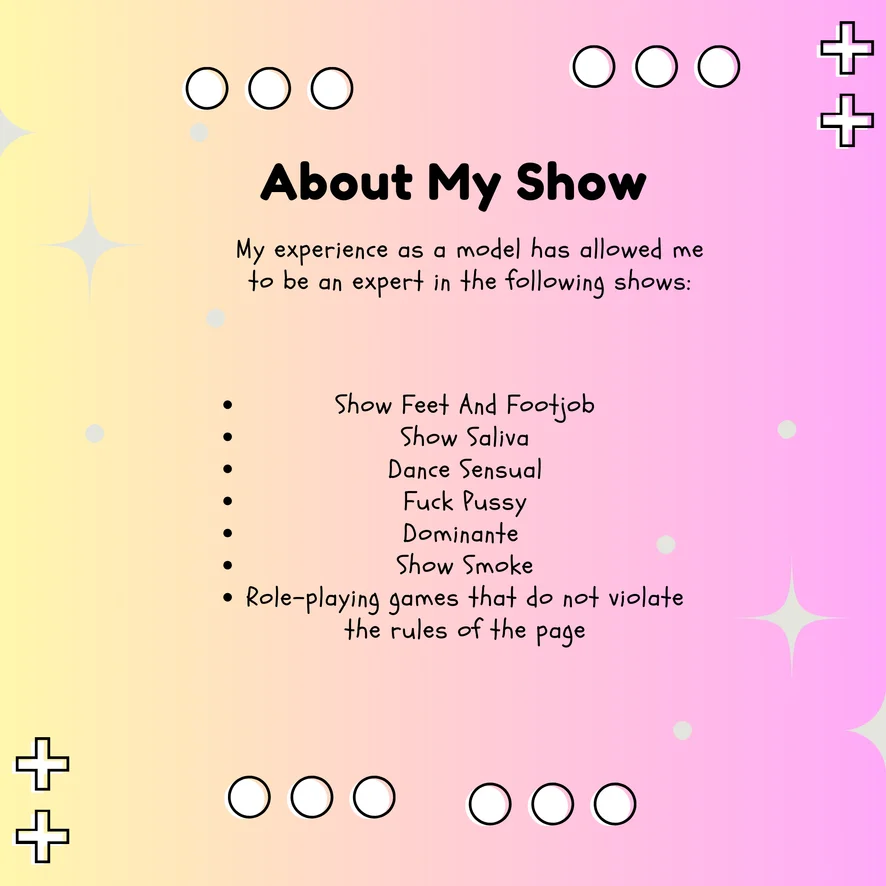 Baile Erótico, Dirty Talk, Azotes, Cameltoe, Dildo o Vibrador, Estriptis, Juego de Roles, Juguetes Sexuales, Mamada, Fumar, Cuero, Nailon, Látex, Squirting, Show con Aceite, Sexo Duro, Orgasmo, Masturbación, Tacones, Garganta Profunda, Fetichismo de Pies